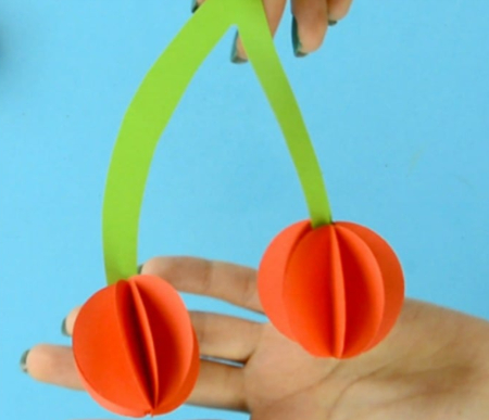حالا کاردستی را برگردانید و برای هر گیلاس، یک نیمکرهی دیگر در سمت دیگر بچسبانید. در نهایت هر گیلاس از دو نیمکره پشت به پشت تشکیل میشود که ظاهر سهبعدی زیبایی به کاردستی شما میدهد.