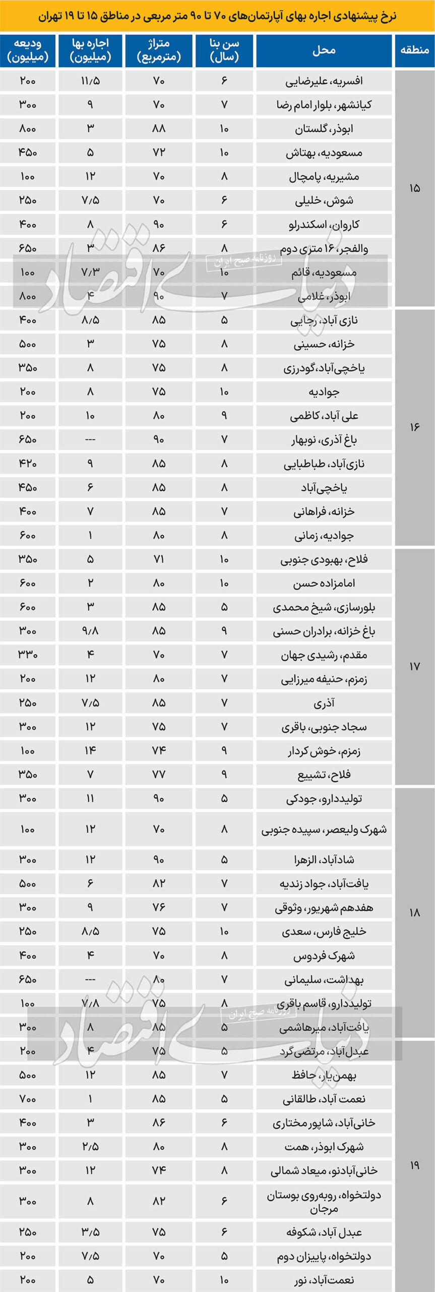 در گزارش دنیایاقتصاد ، بازار اجاره مسکن این مناطق مورد بررسی قرار گرفته است. فایلهایی که برای اجاره آپارتمانهای میانمتراژ در این 5 منطقه جنوبی شهر در حال حاضر در بازار وجود دارد، با ارقام میانگین اجارهبهای ماهانه حدود 7 میلیون تومان و پول پیش (رهن) حدود 350 میلیون تومان از سوی مالکان عرضه شده است.
