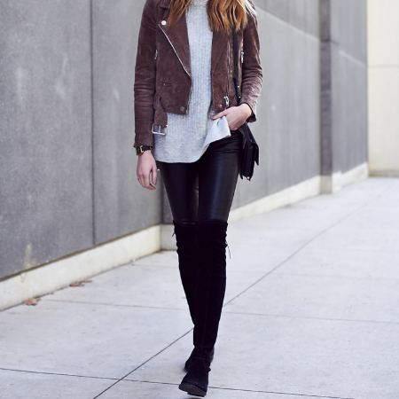 5. استایل پاییزی خاص با کاپشن چرم قهوهای