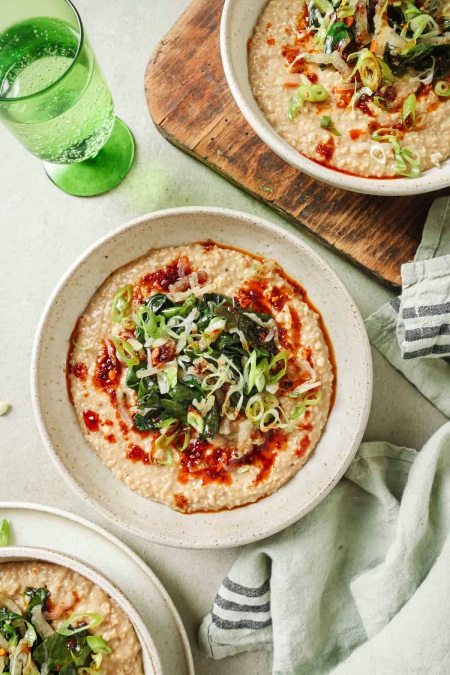 جو دوسر کسل کننده و لجنی را با این نسخهٔ بسیار برتر و شور آن که با چیلی کریسپ همراه است، جایگزین کنید! این صبحانهٔ گرم و دلچسب شامل جو دوسر برش خوردهٔ نرم و جویدنی پخته شده در آبگوشتی غنی از اومامی، سبزیجات تفت داده شده و ریختن چیلی کریسپ چینی برای طعمی تند، سیرمانند و ترد است؛ آغازکننده ای منحصربه فرد، رضایت بخش و مغذی برای روز شما!