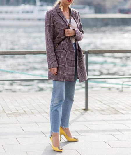 اگر قد بلند هستید پالتو چهارخانه بزرگ را با شلوار جین راسته فاق بلند ست کنید