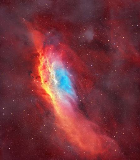 برجستهترین درخشش سحابی کالیفرنیا در این عکس، نور قرمزرنگ مشخصه اتمهای هیدروژن است که با الکترونهای ازدسترفته در بلندمدت ترکیب میشوند و توسط نور پرانرژی ستارهها از بین میروند (یونیزه میشوند).