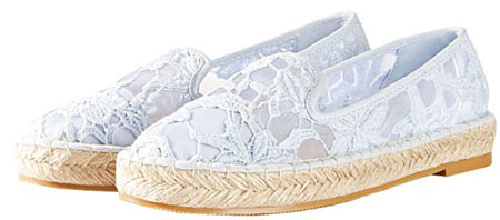 این کفش تمام ویژگیهای یک نمونه محبوب روزها را دارد: 1- رنگ روشن، 2- داشتن لژ یکسره با بافت حصیری، 3- داشتن رویهای مشابه کفشهای کلاسیک، 4- استفاده از پارچههای مختلف به جای چرم و جیر مرسوم در کفشها. اضافه کردن دو سوراخ در دو طرف کفش هم خلاقیت این طراح است.
