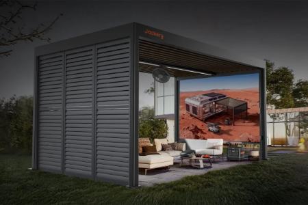 آلاچیق خورشیدی Jackery از آلومینیوم با مقاومت بالا ساخته شده است و قابلیت ذخیرهی انرژی در محصولات پشتیبان خانگی مانند Explorer 5000 Plus را دارد. این آلاچیق به صفحهنمایش پروژکتور کشویی و پریز AC مجهز است تا دستگاهها را شارژ یا تجهیزات برقی مانند چمنزن برقی را تغذیه کند.