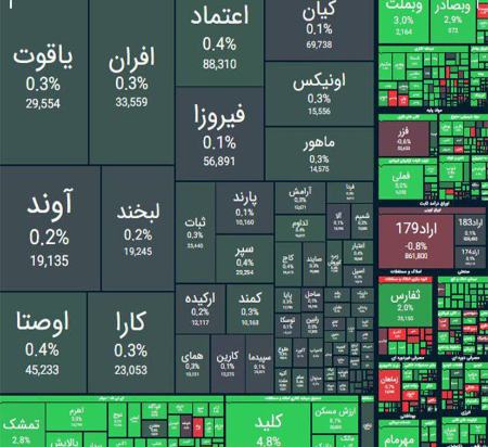 یاقوت، افران و فیروزا بیشترین ارزش معامله و نمادهای وبصادر، وبملت و ذوب بیشترین حجم معامله را در بورس تهران تجربه کردند.