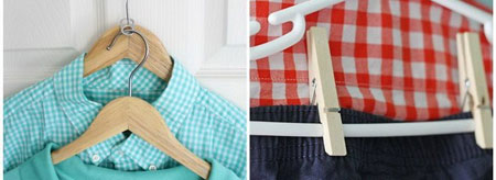 وقتی شلوارها را روی چوب لباسی می اندازید جای تا روی آنها باقی می ماند می توانید با استفاده از گیره لباس از یک چوب لباسی برای یک ست کامل بلوز شلوار استفاده کنید و البته شلوار شما تا هم نمی اندازد. (بیشتر بخوانید: روش آویزان کردن شلوار به چوب لباسی)