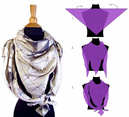 1- روسری مربعی خود را از قطر تا میزنید. مثلث به دست آمده را جلوی سینه خود میاندازید.