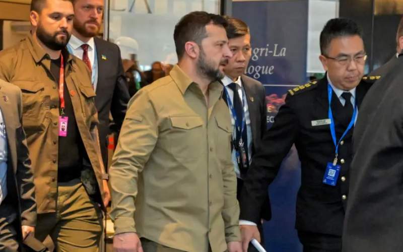 زلنسکی با پوشیدن لباس سبزرنگ همیشگی خود در آخرین روز از برگزاری مجمع گفتوگوی شانگری-لا در سنگاپور سخنرانی کرد.