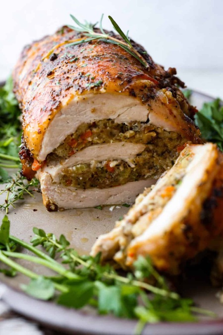 رولت بوقلمون، لطیف و سرشار از طعم های محبوب روز شکرگزاری است. سینه بوقلمون بدون استخوان صاف شده و با مواد پرکننده (استافینگ) رول می شود.