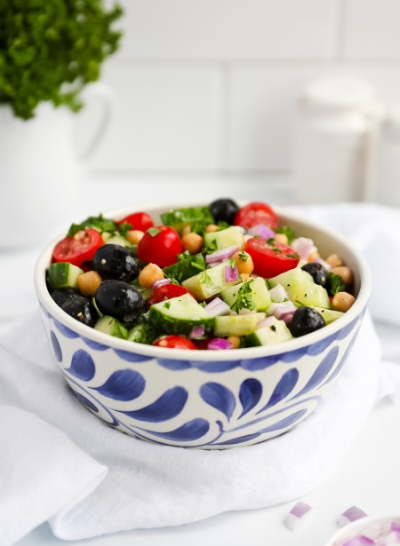 • این سالاد خیار و گوجه یونانی با مواد تازه تهیه می شود و راهی عالی برای افزایش مصرف روزانه سبزیجات است.