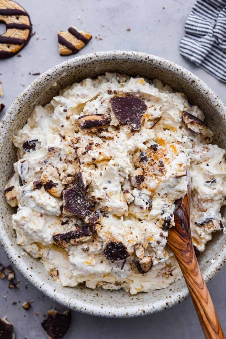 این سالاد کوکی خوشمزه و جذاب را به عنوان دسر یا پیش غذا سرو کنید! همه عاشق پایه پودینگ نرم و شیرین آن خواهند شد که با پرتقال ماندارین، آناناس خردشده و کوکی های راه راه فاج مخلوط شده است.