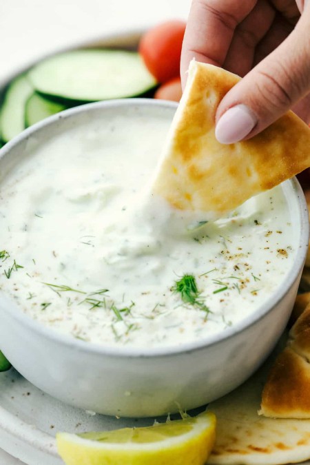 • نان پیتا یا نان: اگر از تزاتزیکی به عنوان دیپ استفاده میکنید، نان پیتا را در آن بزنید تا یک میانوعده نرم و لذیذ داشته باشید.