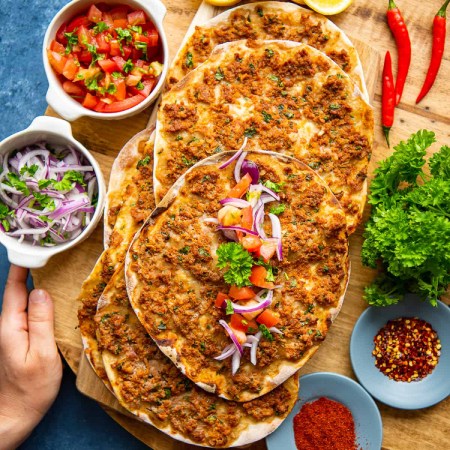 این پیتزا به سبک ترکی یک نان مسطح ترکی است که با سس تازه تشکیل شده از گوجه فرنگی، فلفل دلمه ای شیرین و گوشت بره خرد شده با مجموعه ای خوش طعم از ادویه های مدیترانه ای پخته شده است. معمولاً با سالاد تازه و سس سیر خامه ای و یا سس فلفل قرمز تند تزیین می شود. این یک وعده غذایی واقعا سبک، اما سیر کننده و خوش طعم است. اگر نتوانم آن را به صورت آماده خریداری کنیم، ارزش وقت گذاشتن را دارد. برای داشتن بهترین طعم، مواد داخل پیتزا را از شب قبل آماده کنید.