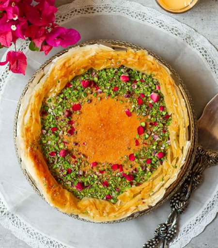 این دسر فوق العاده غنی، آجیلی، شیرین و گلدار شبیه هیچ چیزکیک دیگری نیست که خورده اید. جوهر باقلوای سنتی را در هر لقمه ای با لایه هایی از آجیل خرد شده و پوسته فیلو سبک و مطبوع به تصویر می کشد. با یک شربت عسل شیرین و مغزدار، این دسری است که همه مهمانان شما را شگفت زده می کند!