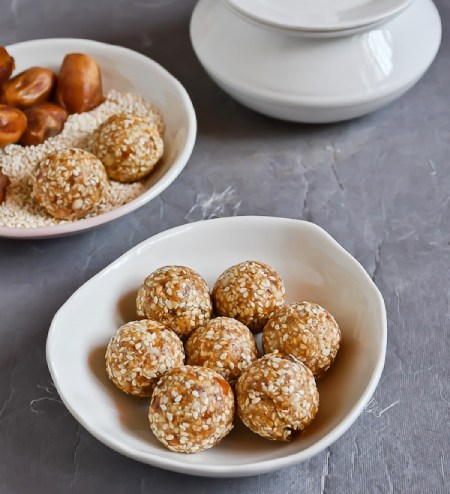 اجازه بدهید مخلوط خرما و کنجد خنک شود، سپس آن را روی سطح کار آشپزخانه پهن کنید و قطر آن را به 2 میلیمتر برسانید و به شکل دلخواه برش و یا قالب بزنید. می توانید آن ها را به اندازه ی گردو گرد کنید.