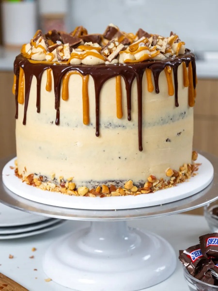 طعم این کیک شکلاتی اسنیکرز درست شبیه آب نبات های مورد علاقه ما است! لایه های کیک شکلاتی مرطوب آن با فراستینگ کره بادام زمینی کرکی و کارامل بادام زمینی خانگی پر شده و سپس کیک با گاناش شکلات شیری پوشانده می شود.