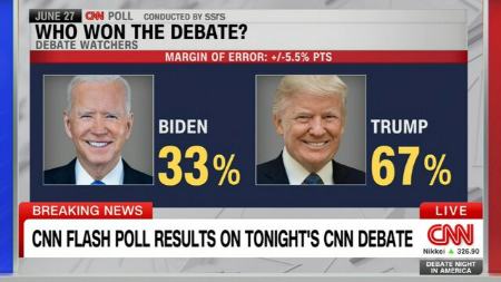 رویهمرفته، نظرسنجی سیانان نشان میدهد که میزان محبوبیت جو بایدن پس از مناظره امروز 6 درصد کاهش یافته و از 37 درصد به 31 درصد رسیده است. در مقابل، ترامپ با عملکرد خود در مناظره توانسته محبوبیت خود را افزایش داده و آن را از 40 درصد به 43 درصد برساند.