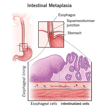 التهاب مزمن مری (ازوفاژیت) یا معده (گاستریت) میتواند به متاپلازی رودهای، یک تغییر سلولی در بافتها، منجر شود. در این وضعیت، سلولهای پوششی معده یا مری شبیه به بافتهای پوششی رودهها میگردند. این تغییر سلولی زمینهساز سرطان است.