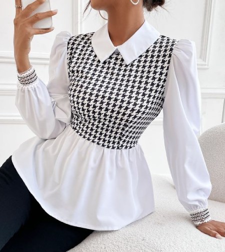 بلوز پپلوم طرح دار: این نوع بلوز دارای طرح های مختلفی مانند گل، راه راه، یا خال خالی است.