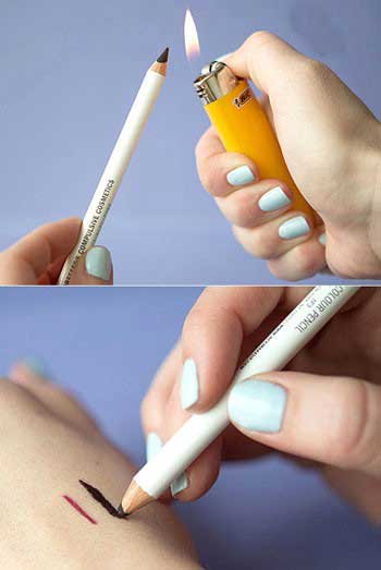 نوک مدادچشم سیاه، سبز، آبی، سفید یا هر رنگ دیگر که کمرنگ است و سخت می توان از آن استفاده کرد را یک ثانیه زیر حرارت فندک نگه دارید. 15 ثانیه آن را کنار بگذارید تا خنک شود. سپس آن را امتحان کنید تا ببینید تا چه اندازه پررنگ تر شده است.