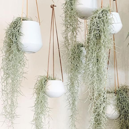 سبدهای آویز: سبدهای آویز از جمله گزینههای محبوب برای نگهداری خزهی اسپانیایی هستند. رشتههای نقرهای ، سبز رنگ این گیاه، به زیبایی از سبد آویزان شده و جلوهای تماشایی به محیط میبخشد.