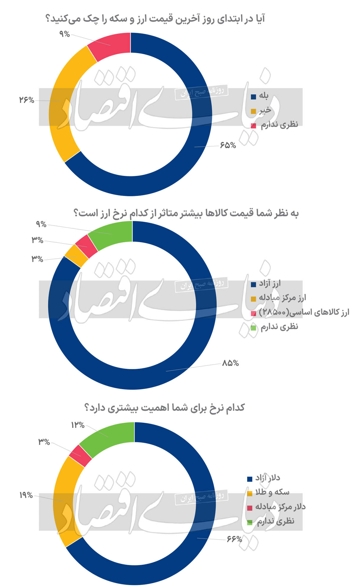 «دنیای اقتصاد» در تازهترین نظرسنجی خود در تلگرام، از مخاطبان سوالاتی درباره ارز پرسید. بر این اساس در کانال تلگرامی «دنیای اقتصاد» از مخاطبان پرسیده شد که «آیا در ابتدای روز آخرین قیمت ارز و سکه را چک میکنید؟»، «کدام نرخ برای شما اهمیت بیشتری دارد؟» و «به نظر شما قیمت کالاها بیشتر متاثر از کدام نرخ ارز است؟». این سوالات که با پاسخ بیش از دوهزار نفر همراه شد، حاکی از آن است که ارز بازار آزاد همچنان مهمترین سیگنالدهنده قیمتی به آحاد اقتصادی به شمار میرود و بیشترین تاثیر را در تعیین انتظارات تورمی دارد.