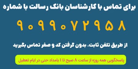 پشتیبانی بانک رسالت شماره ۹۰۹۹۰۷۲۹۵۸ ازتلفن ثابت بدون کدوصفر