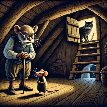 روزی روزگاری، دو موش در کنج سقفی در خانهای زندگی میکردند. یکی از آنها موشی پیر و باتجربه بود که روزگار را دیده و فراز و نشیب آن را آزموده بود. دیگری موشی جوان و بیتجربه بود که هنوز طعم تلخ واقعیت را نچشیده و به اصطلاح، خام و نادان بود.