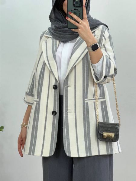 – مانتو لینن طوسی + کراپ سفید + شلوار جین بویفرند
