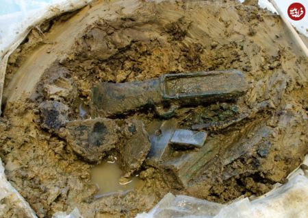 همچنین قطعاتی از ورقهای فلزی و یک میله کوچک از آلیاژ مس که احتمالاً بخشی از دسته اسکنه یا ابزاری دیگر بوده است بهدست آمد. علاوه بر این، مواد آلی و سوختهای در میان خاک متراکم باقی مانده بودند که اطلاعات ارزشمندی درباره شرایط و زمینه تاریخی این گنجینه ارائه میدادند.