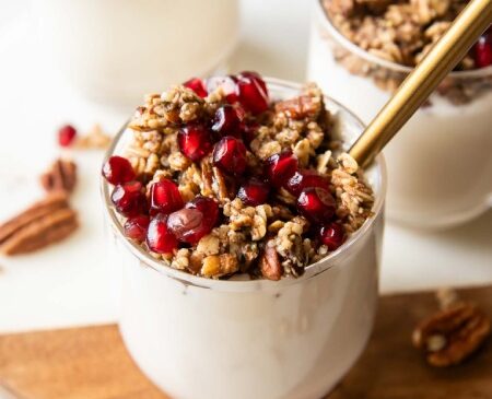در این مقاله از ساختمانیار، با طرز تهیه پودینگ انار و گردوی پکان آشنا می شوید. پارفیت انار و پکان، صبحانه ای خوش طعم و مغذی با 18 گرم پروتئین است که با لایه های خامه ای پنیر کاتیج، استرویزل ترد پکان و دانه های آبدار انار، طعمی شبیه دسر دارد. این دستور سریع و ساده، تنها در 10 دقیقه آماده می شود و گزینه ای ایده آل برای صبح های شلوغ یا میان وعده های سالم پاییزی است.