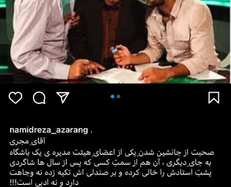 در روز 18 اردیبهشتماه، محمد حسین میثاقی، مجری فوتبال برتر درباره انتصاب سرپرست به گزارش خبرآنلاین,جدید مدیرعاملی باشگاه استقلال گفته بود: «فرشید سمیعی چه آدم جالبی است که توانسته با آدمهای مختلف کار کرده و ثبات داشته باشد.» اظهارات میثاقی با واکنش تند حمیدرضا آزرنگ، بازیگر سینما و تلویزیون روبهرو شد. او با انتشار عکس قدیمی از میثاقی در کنار عادل فردوسیپور و حمید محمدی، خطاب به او نوشت: «البته که نمیدانم بگویم خوب است […]