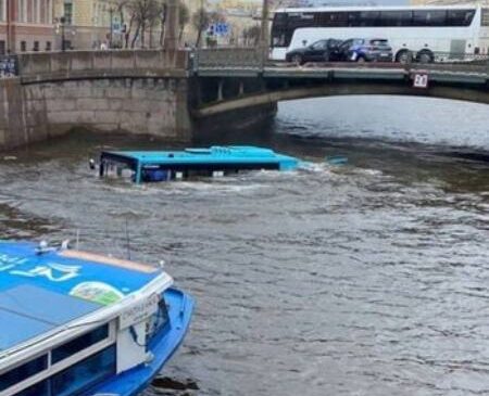 در شهر «سنت پترزبورگ» روسیه یک دستگاه اتوبوس به همراه مسافران به داخل رودخانه «مویکا» افتاد و به طور کامل زیر آب رفت.
